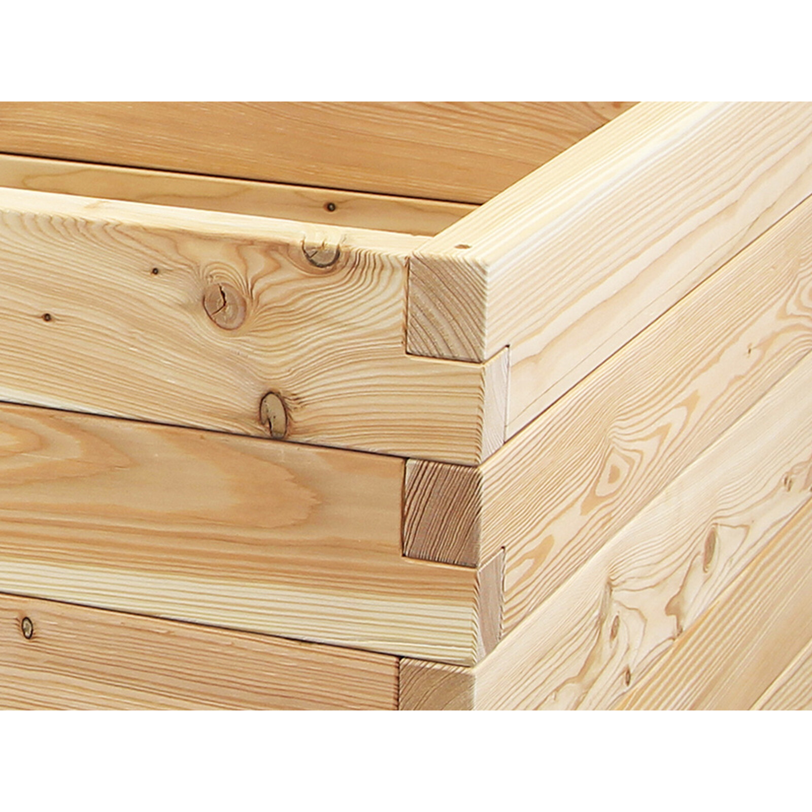 Dieses große, rechteckige Holzhochbeet aus besonders massiven Lärchenhölzern mit einer Dicke von 4,5cm hält der Witterung circa 10 Jahre stand, auch ohne einen zusätzlichen Schutz durch Noppenfolie oder Öl. Das Hochbeet wird aus gehobeltem Lärchenholz gearbeitet. Die Kanten sind zusätzlich gefast (abgerundet), es bleiben also keine scharfen oder ausgefranste Ränder an den Hölzern.