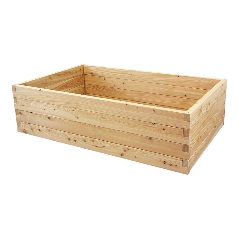 Das enthaltene rechteckige Hochbeet aus Hartholz hat die Abmessungen 190cm x 120cm x 52cm (BxTxH). Die massiven Holzbohlen aus Lärchenholz haben eine außergewöhnlich Dicke von 4,5cm und werden in regionalen Werkstätten verarbeitet. Durch Führungslöcher in den Ecken der Lärchenbohlen und die 4 enthaltenen Rundstäbe aus Metall kann das Beet einfach ohne Schrauben oder Bohren aufgebaut werden.